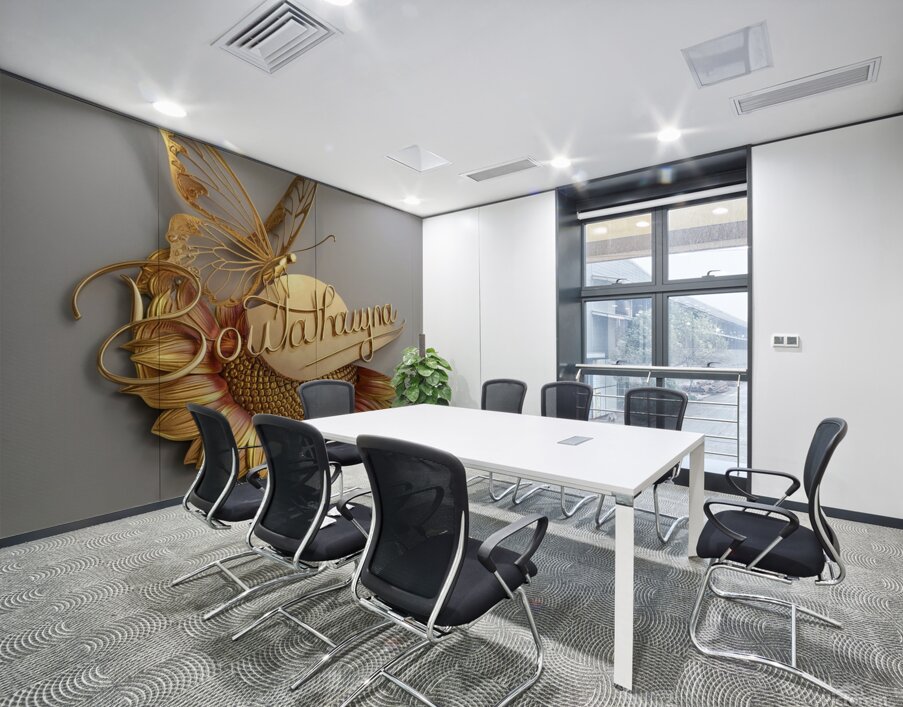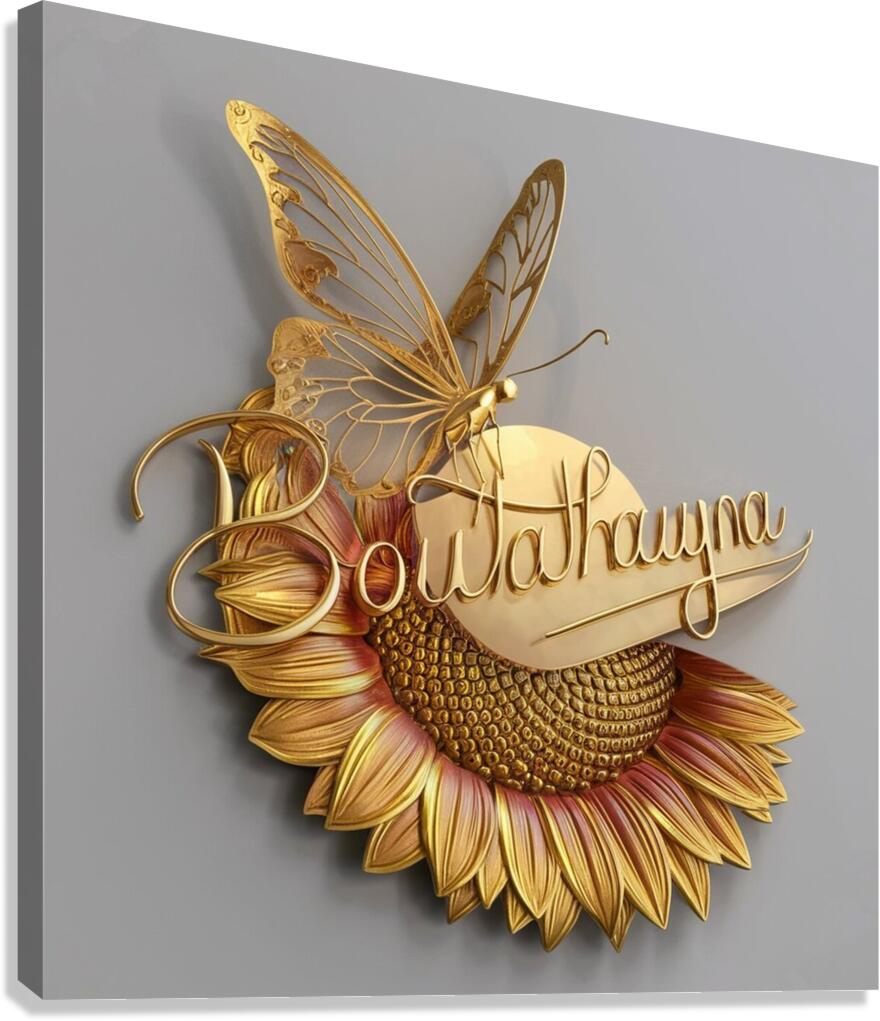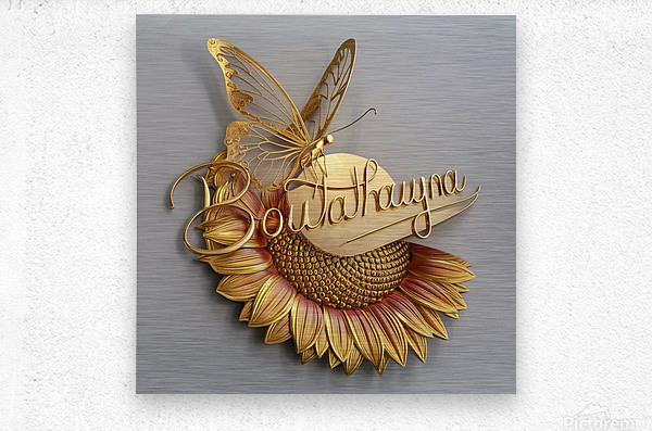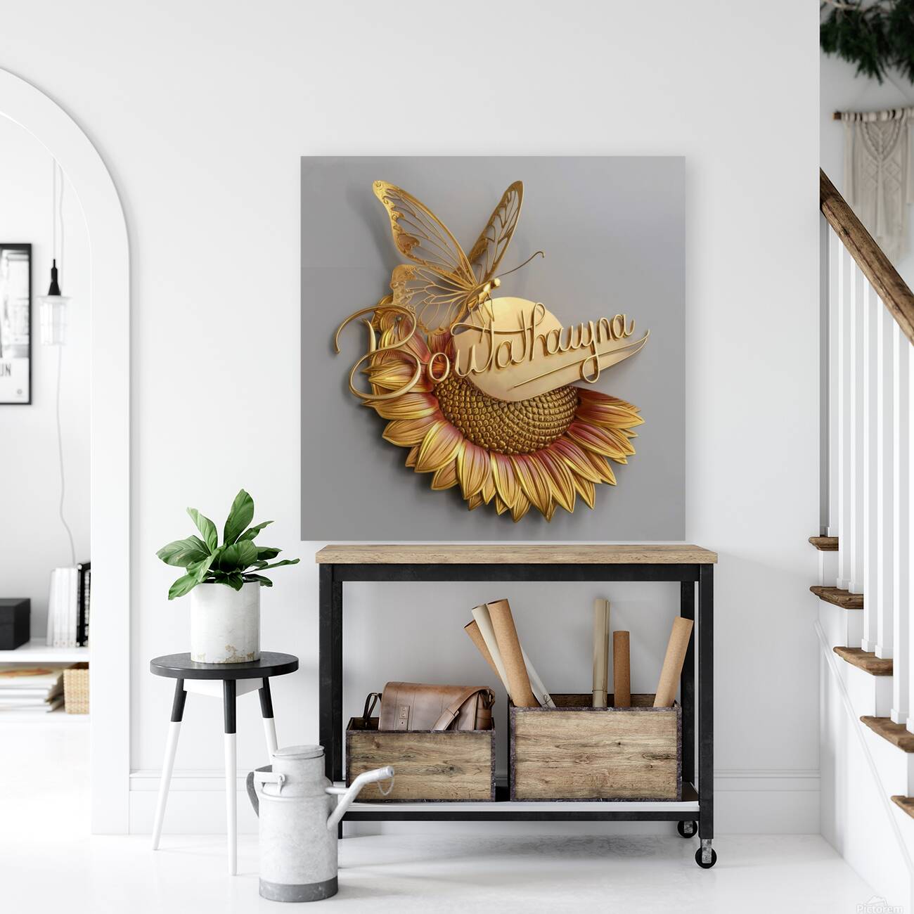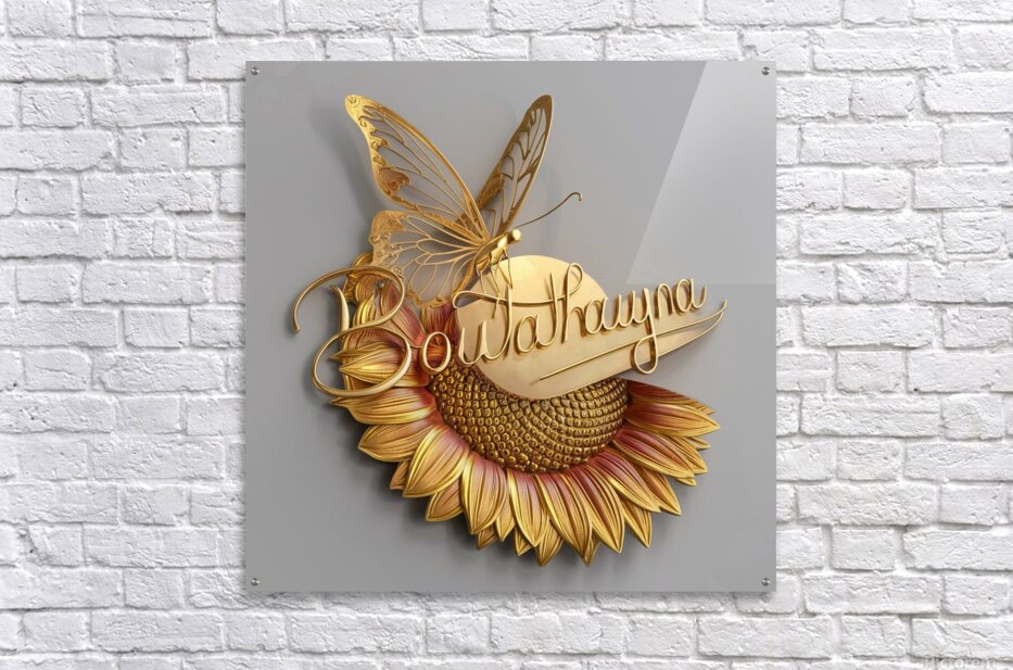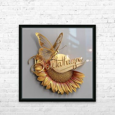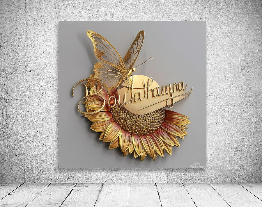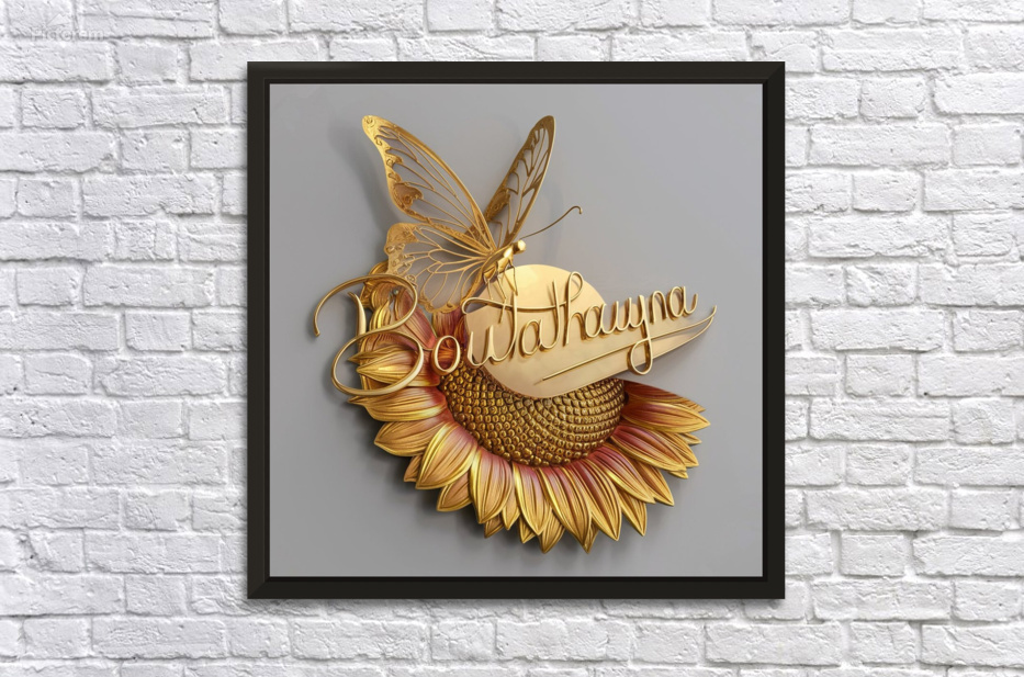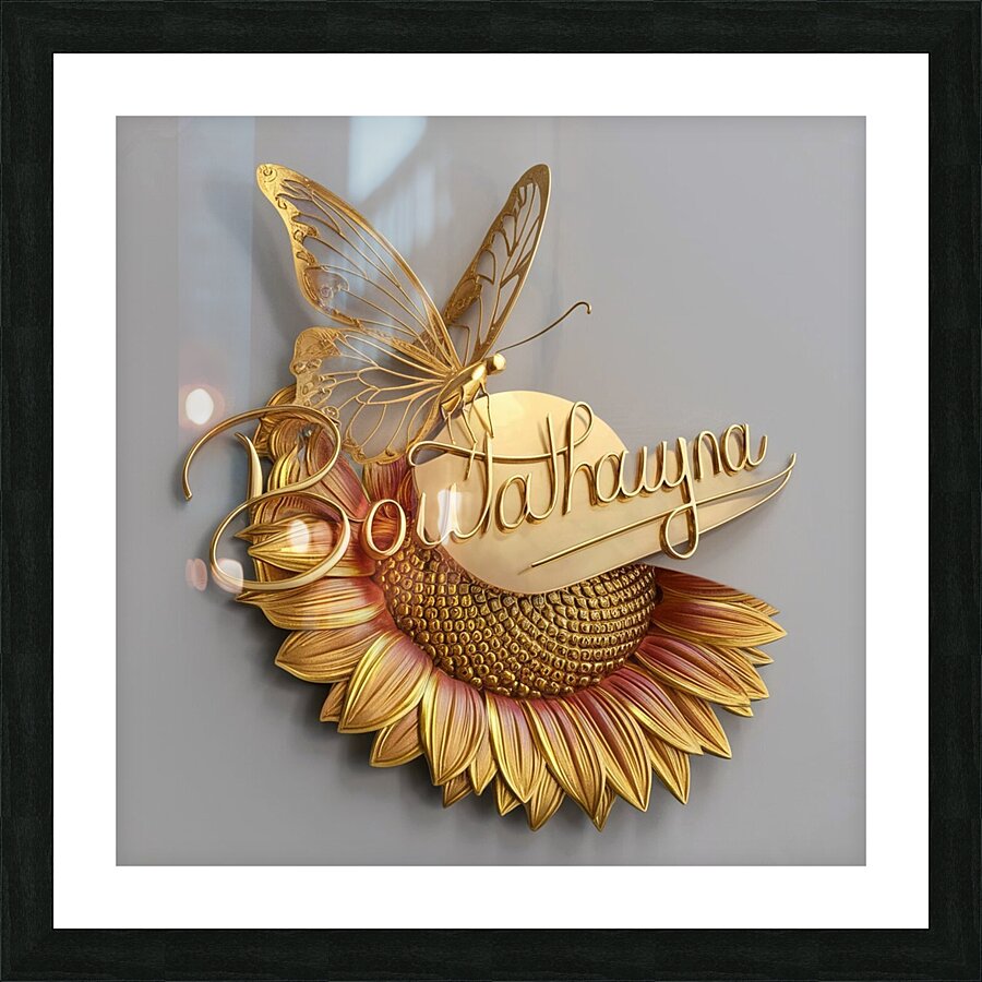 A high-resolution 3D rendering of the Bouthayna logo, featuring a mesmerizing golden butterfly perched atop an intricately designed golden sunflower. ...[+]
