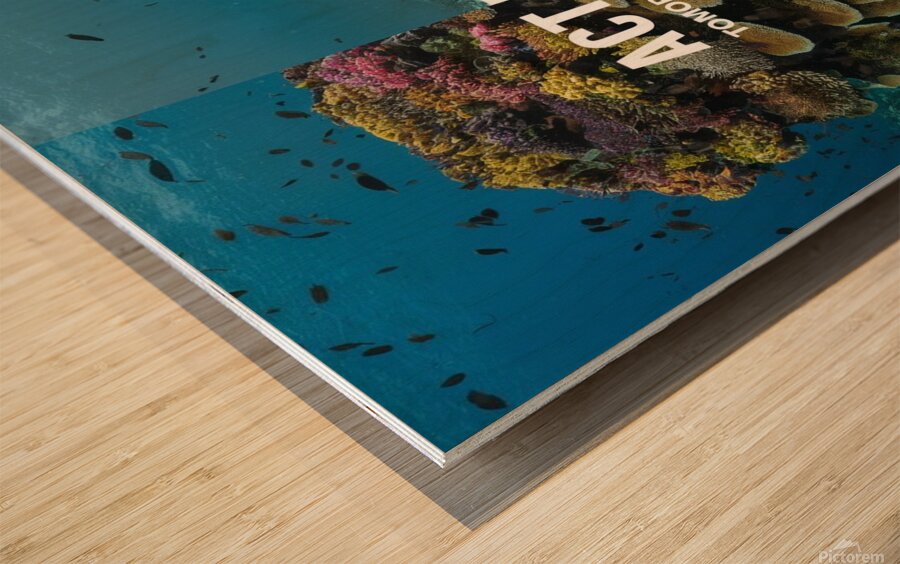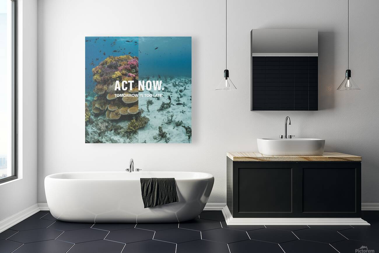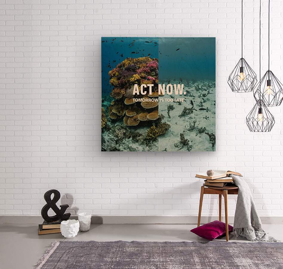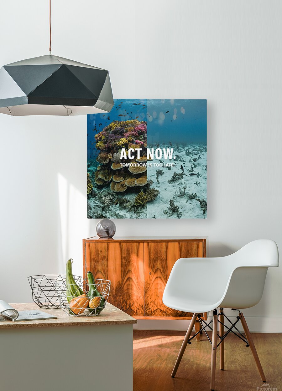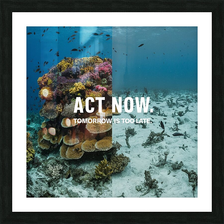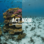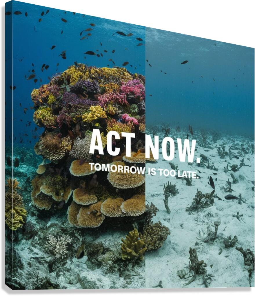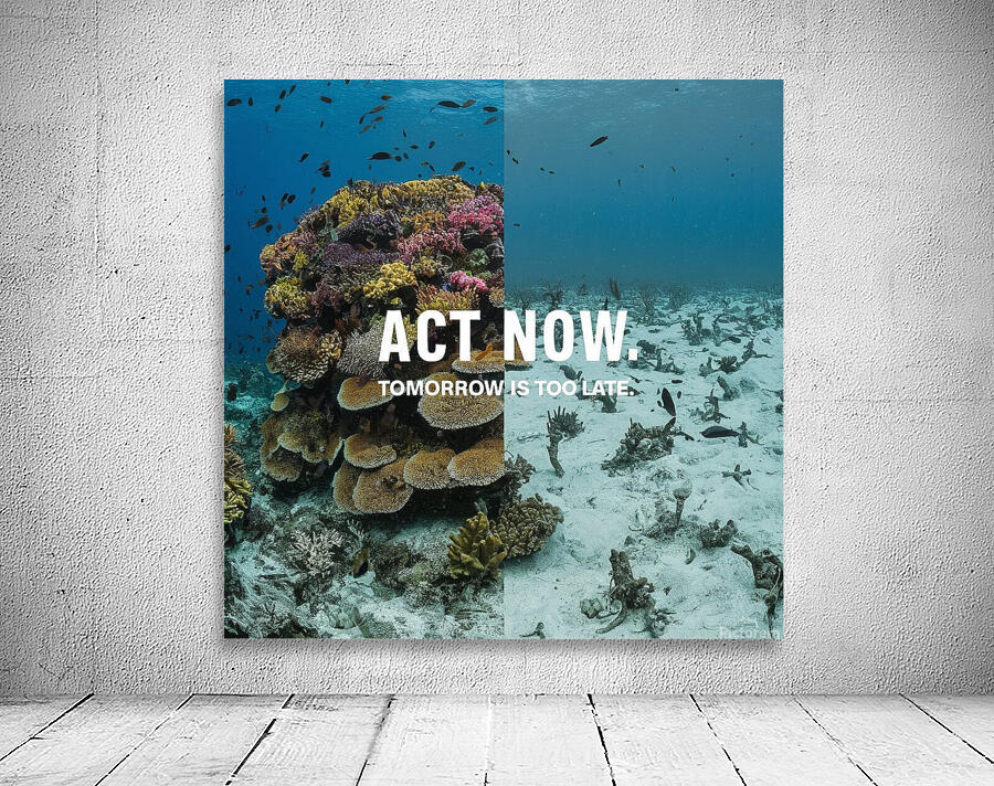 A split image showing a vibrant coral reef on one side and a bleached, dead reef on the other. The tagline reads: "Act Now. Tomorrow is Too Late.