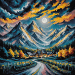 "Mountains on a moonlit night, rendered in an expressionist style, vibrant, painting, fashion, product