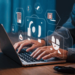 A person using a laptop at a table, a stock photo by Tivadar Csontváry Kosztka, winner of the Shutterstock contest. Les Automatistes theme, pixel-perfect composition. Perfect for desktop wallpaper, photo, 3d render, illustration