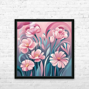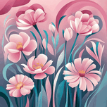A vibrant, abstract floral design featuring a variety of flowers in soft pink and blue tones. The flowers are depicted in a whimsical, almost dreamlik...[+]