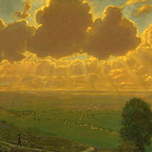 Sunburst Over Säckingen, Black Forest | Historic Art Reproductions | 1910 by Hans Thoma (German, 1839-1924) Slightly remixed for amplified sunlight glow, tis beautiful 1910 landscape art will look terrific in your home or office.
