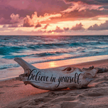 A picture of a breathtaking sunset at the beach, with a beautiful blue sky glowing with sunset colors. and beautiful english handwriting for this phrase^^Believe in yourself^^