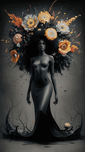 This striking image evokes a sense of ethereal, otherworldly wonder. The dramatic floral crown, composed of vibrant, almost supernatural blooms, frames the mysterious female figure with a sense of regal, almost mythical presence. The stark contrast between the shadowy silhouette and the vivid, expressive flowers creates a captivating tension, drawing the viewer into a realm of imagination and emotion. The moody, cinematic atmosphere, with its hints of darkness and mystery, lend the work a powerful, evocative quality, inviting the viewer to ponder the deeper, symbolic resonance of the imagery. This artwork transforms the human form into a canvas for conceptual, interpretive expression, blurring the boundaries between the physical and the ethereal.