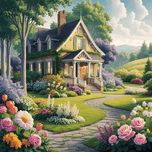 This artwork depicts a charming house in a serene countryside setting, surrounded by a vibrant garden of blooming flowers. The lush garden, filled with roses, tulips, and daisies, is framed by tall trees and gentle rolling hills under a clear blue sky. A cobblestone path winds through the manicured lawn, enhancing the peaceful and picturesque atmosphere of this idyllic retreat.