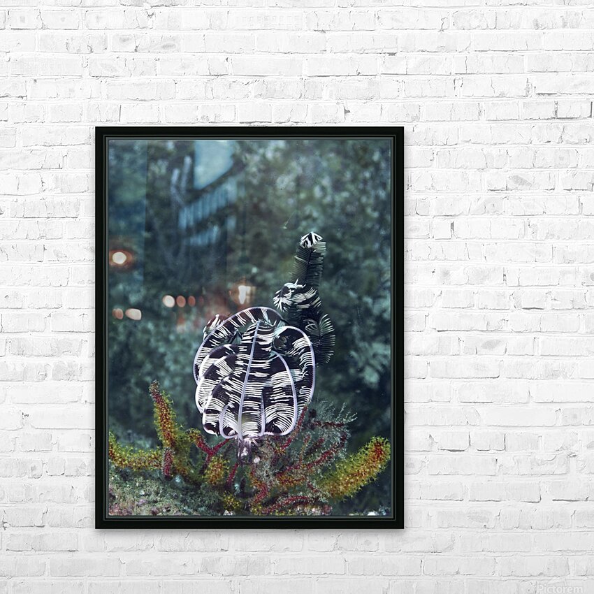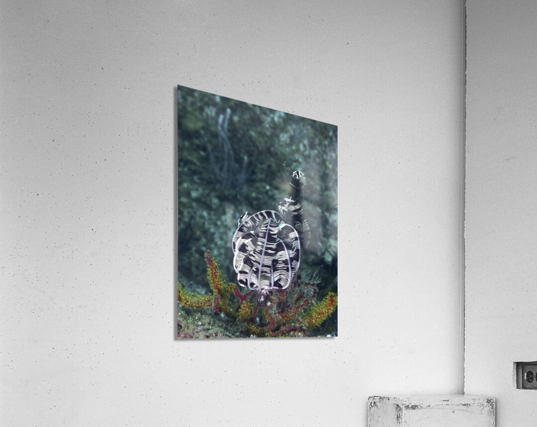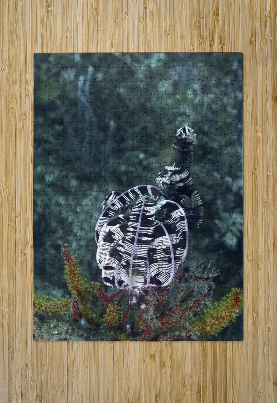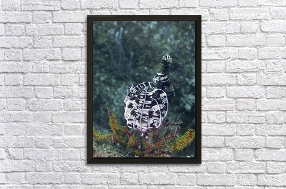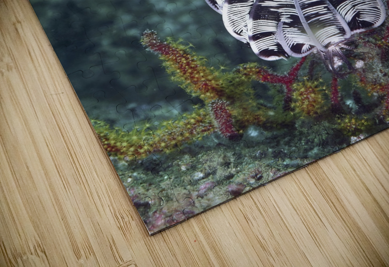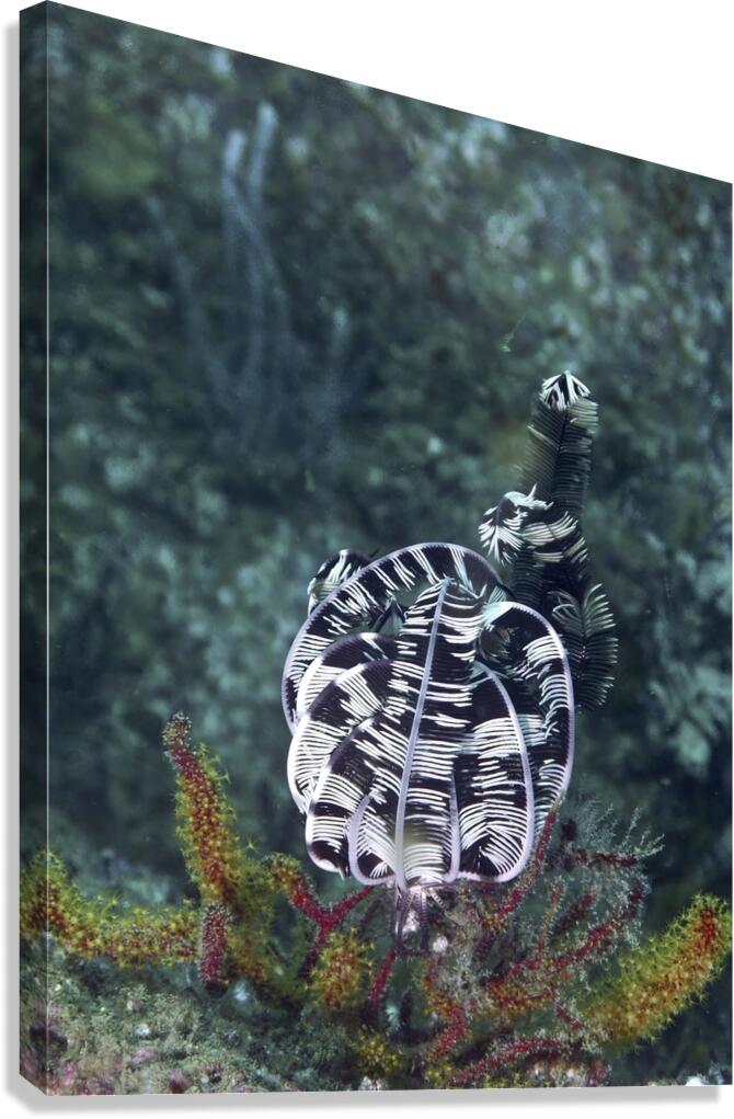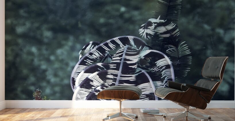 An undisturbed black-and-white feather starfish rests, its arms folded up. Produced specifically by DeepEarth Photography for use in the hospitality i...[+]