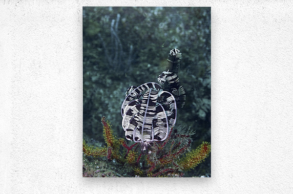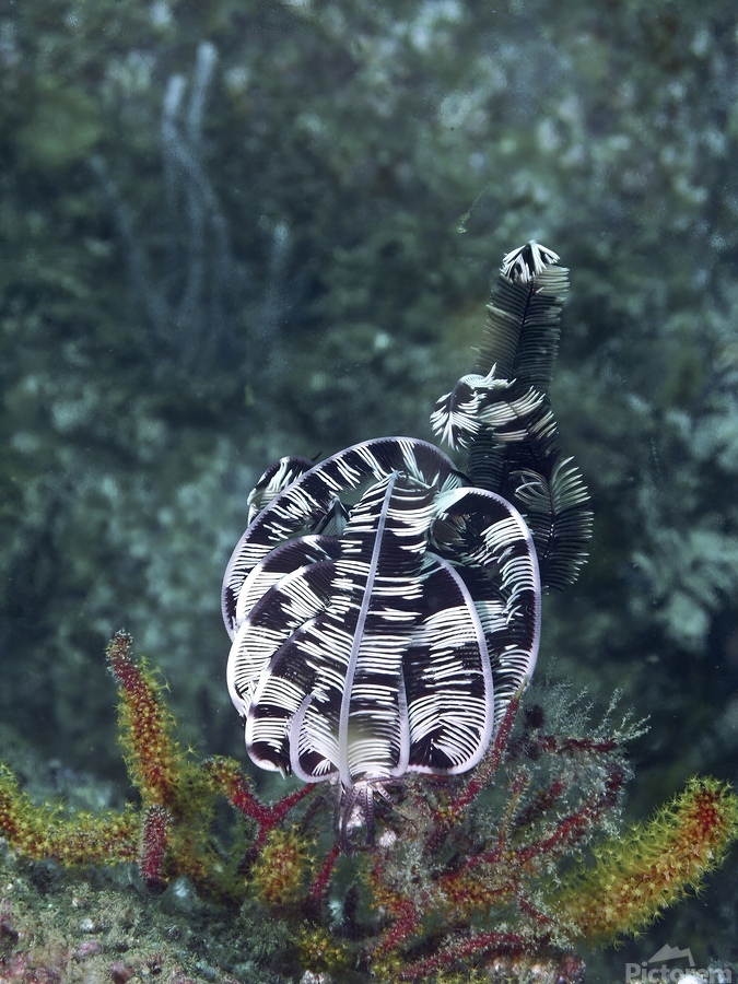 An undisturbed black-and-white feather starfish rests, its arms folded up. Produced specifically by DeepEarth Photography for use in the hospitality industry. No warranties are stated or implied. Credits: DeepEarth Photography