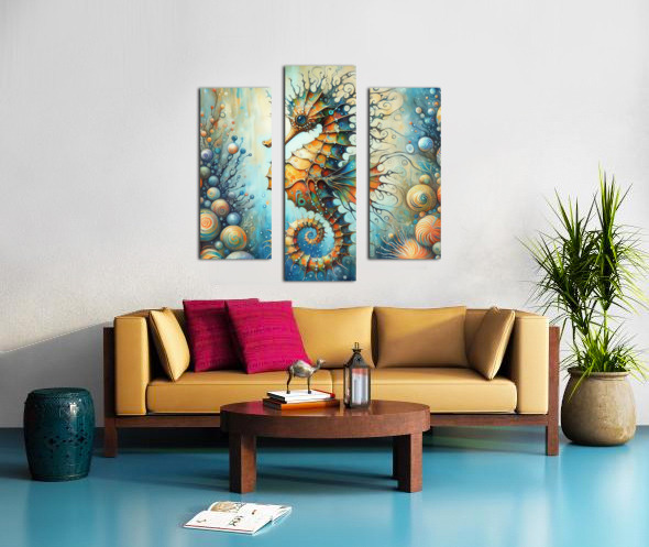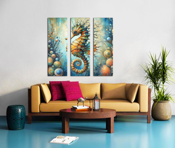 300 Mixed media painting of a whimsical seahorse. Canvas print