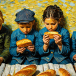 Four children eating bread with appetite