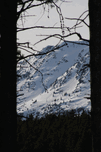 A snow-covered mountain stands in the distance behind trees. The sun highlights the mountain beautifully.