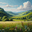 This image depicts an oil painting of a peaceful rural landscape. In the foreground, there is a field of lush green grass interspersed with some colorful wildflowers. In the background, there are rolling green hills dotted with tall trees. In the distance, a clear blue sky appears with some scattered white clouds.