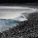 The shoreline, adorned with dark pebbles, evokes a lunar landscape that creates a mysterious, enigmatic atmosphere. The waves, adding a touch of colour, establish a striking contrast between darkness and light, between the solidity of the pebbles and the fluidity of the ocean, offering a unique and captivating vision of this unusual shoreline.