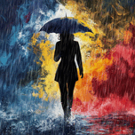 A striking abstract artwork ByT Mann Nyc featuring the silhouette of a Woman Umbrella resolutely in the midst of heavy rain. The painting is rendered ...[+]