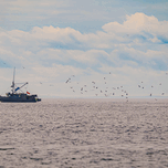 Flock of seaguls trailing a fishing boat off the coast of Nova Scotia.