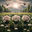 Un champs de muguet avec 3 beaux bouquets de muguet en avant plan vu de près, au loin un levé de soleil sur une monta gne, des oiseaux volent, deux...[+]