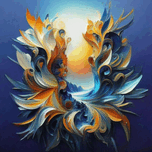 An ultra-realistic, photographic image of a vibrant, abstract floral composition with dynamic, swirling petals in shades of orange, blue, and white ag...[+]