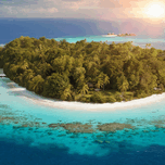 A breathtaking aerial view of a lush, verdant island paradise. The island is surrounded by crystal-clear turquoise waters, with white s andy beaches...[+]