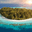 A breathtaking aerial view of a lush, verdant island paradise. The island is surrounded by crystal-clear turquoise waters, with white s andy beaches extending along its shore. Tropical palm trees sway gently in the midst of the island, and a vibrant coral reef can be seen beneath the surface of the water. In the distance, a small group of native huts can be seen nestled among the lush vegetation, adding to the peaceful atmosphere. The sun casts a warm, golden glow over the island, making it a perfect paradise for relaxation and adventure
