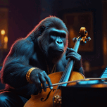 Cello playing gorilla with gold, diamond jewelry and sunglasses. Cinematic lighting, surrounded by music instruments, pianos, speakers and sports cars...[+]