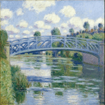 A photo-realistic digital painting of a scenic bridge over a tranquil river, inspired by the impressionist style of Claude Monet. The bridge is made o...[+]