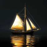 "Golden Sails" is a captivating digital art piece portraying a majestic sailboat from the 1800s, bathed in golden light against a dark, serene background. The sailboat's illuminated sails create a striking contrast with the night, reflecting beautifully on the calm water below. This artwork embodies the elegance and tranquility of nautical journeys, evoking a sense of timeless adventure and serenity. Perfect for adding a touch of maritime charm and sophistication to any space.