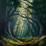 This painting captures the essence of a mystical forest, where towering trees with dense green leaves create an enchanting canopy. Sunlight filters th...[+]