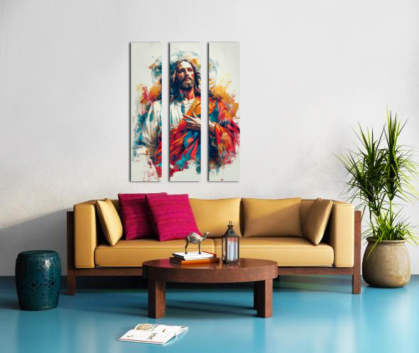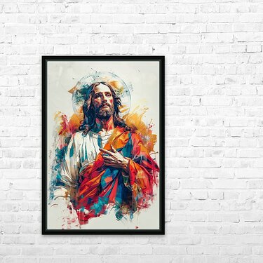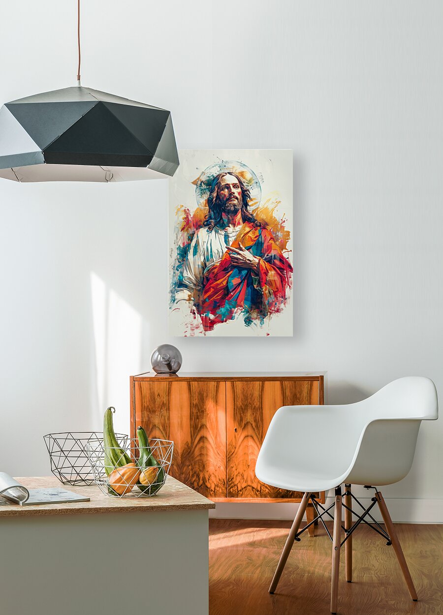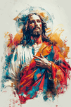 Colorful modern digital artwork of jesus with a halo and vibrant splashes