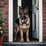 Watchful guard: A German shepherd standing alert at the entrance of a home.