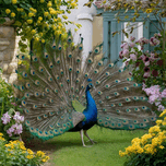 A peacock spreading its wings in a beautiful and wonderful way with all its natural colors. Place the peacock in a garden with attractive flowers.