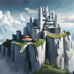 Digital art depicting a castle-like house designed by architects Toyo Ito and Frank Gehry on the edge of a rocky precipice, shrouded by clouds below t...[+]