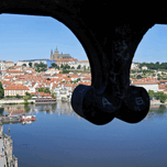 CZECH REPUBLIC. PRAGUE. FRAMED VIEW OF CHARLES BRIDGE VLTAVA RIVER AND THE CASTLE HRAD