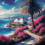 Tranquil coastal scene A tall palm tree stands prominently on the beach Right, and its fronds sway gently. Next to the tree, vibrant pink flowers bloom, contrasting beautifully with the blue of the ocean and sky. A path made of white stones passes through the vegetation and leads to a group of white buildings with red roofs. These structures are located on the edge of a cliff overlooking the blue waters. In the distance, the coastline stretches, with more buildings and a glimpse of the city. The sky is clear with some scattered clouds, suggesting a sunny day., Vibrant art, drawing, conceptual