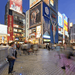 Japan. Kansai. Osaka. Illuminated signboards in Dotonbori District at sunset