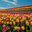 A field of tulips in different colors under a blue sky