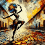 “Rhythms of the Soul" depicts a woman in a dynamic pose, embodying the energy and rhythm of African music and dance. Set against a backdrop of a lively urban street, the artwork conveys a sense of movement and harmony. It celebrates the powerful connection between music, dance, and the African spirit.