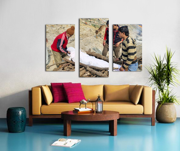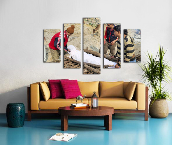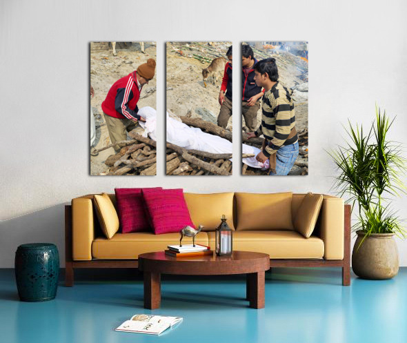 India. Varanasi Benares Uttar Pradesh. The sacred rite of hindu cremations by the river Ganges Canvas print