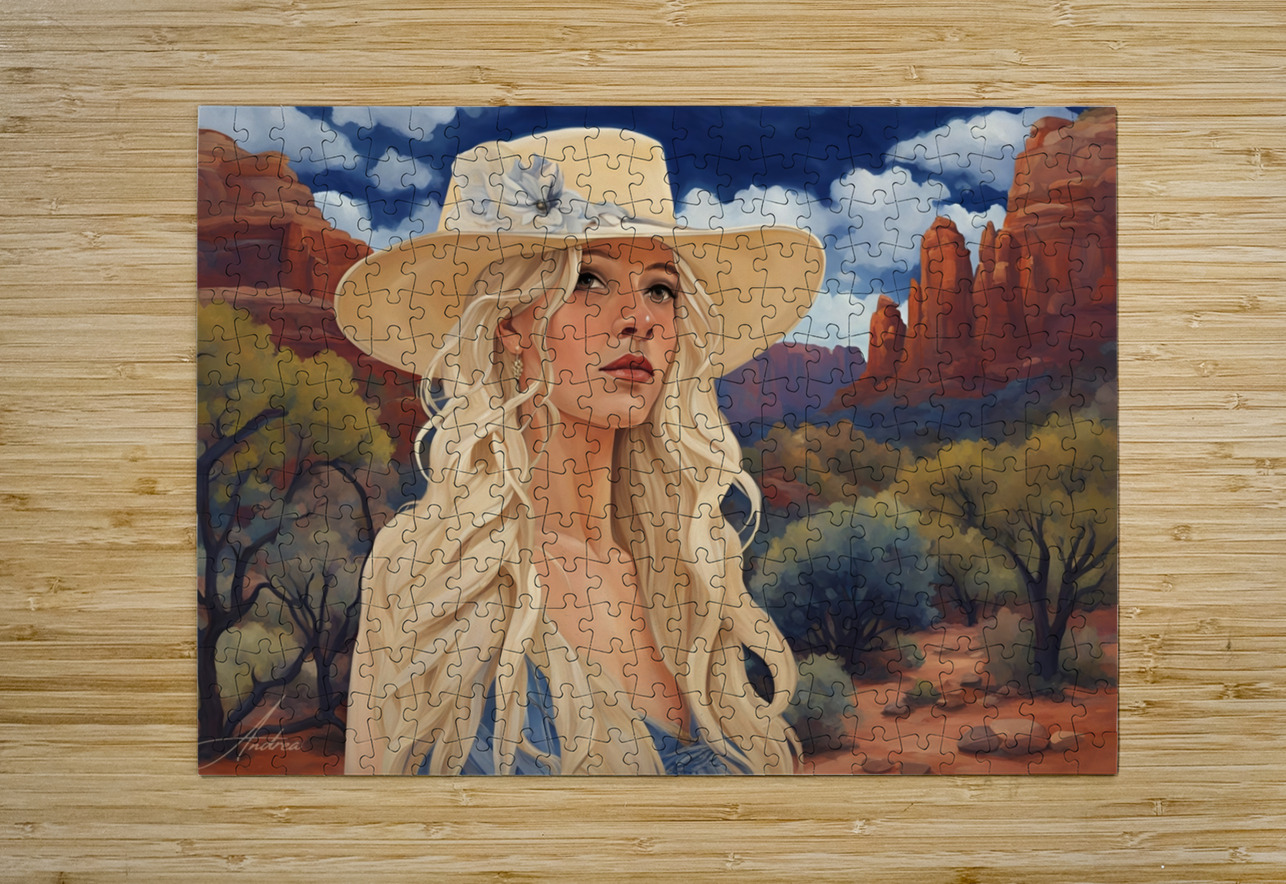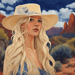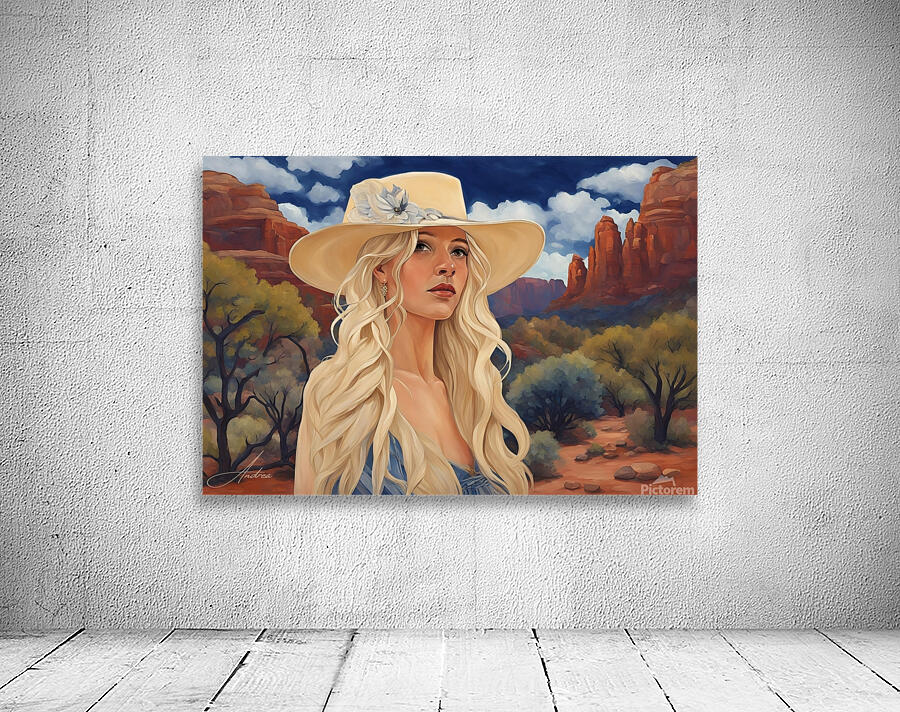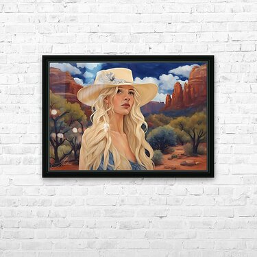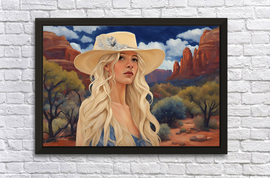 Lovingly created by Andrea Record, Soul Searcher will delight all Sedona, Southwestern, Cowgirl and Blonde lovers! Looks great in all mediums. AI assisted digital work