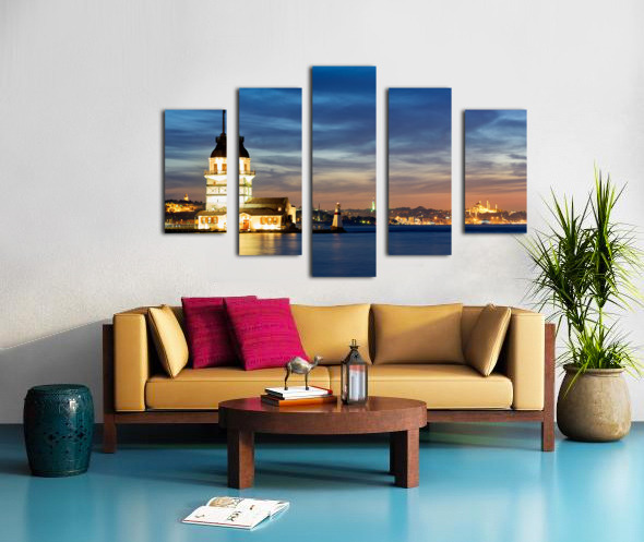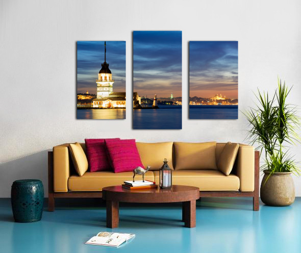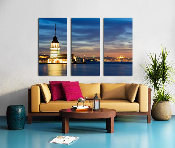 Istanbul Turkey. The Maidens tower on the Bosphorus and the Süleymaniye Mosque at sunset Canvas print