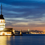 ISTANBUL TURKEY. THE MAIDENS TOWER ON THE BOSPHORUS AND THE SüLEYMANIYE MOSQUE AT SUNSET