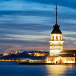 ISTANBUL TURKEY. THE MAIDENS TOWER ON THE BOSPHORUS AND BLUE MOSQUE HAGIA SOPHIA AT SUNSET