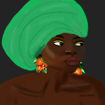 A vibrant portrait of a regal black woman adorned in a lush green headwrap, her ears graced with elegant earrings crafted from the vibrant Jamaican fr...[+]