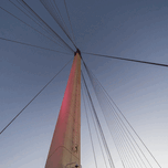 Another view looking up one of the support posts and cables of the Bob Kerrey Pedestrian Bridge in Omaha, Nebraska, United States early in the morning. The posts is lit up in pink. It changes colors throughout the night an morning. The Bob Kerrey Pedestrian Bridge is a cool shaped 3,000-foot footbridge. it curves like a snake. It's a cable suspension bridge and you can also feel it move if someone runs by or rides by on a bike or scooter. It crosses over the Missouri River and the other side connects it to Council Bluffs, Iowa. This photo was taken by Jennifer White with Timeless Moments Photography. All images are copyrighted © Timeless Moments Photography/Jennifer White. All rights reserved. Please note the watermark does not print on ordered products.
