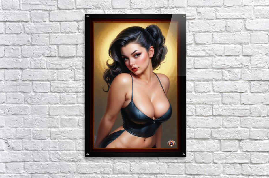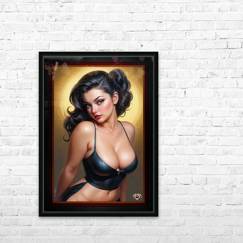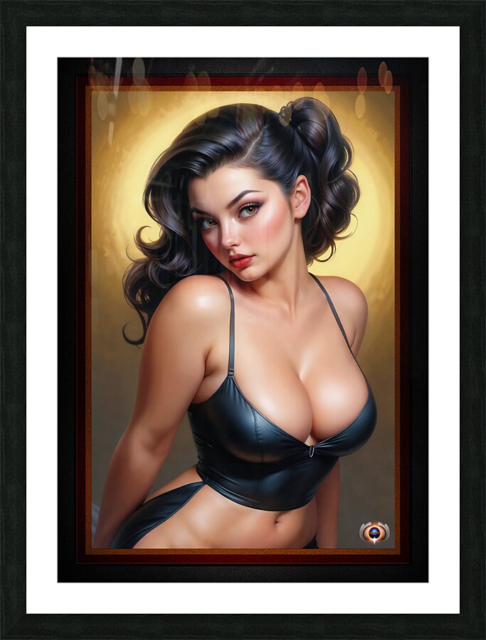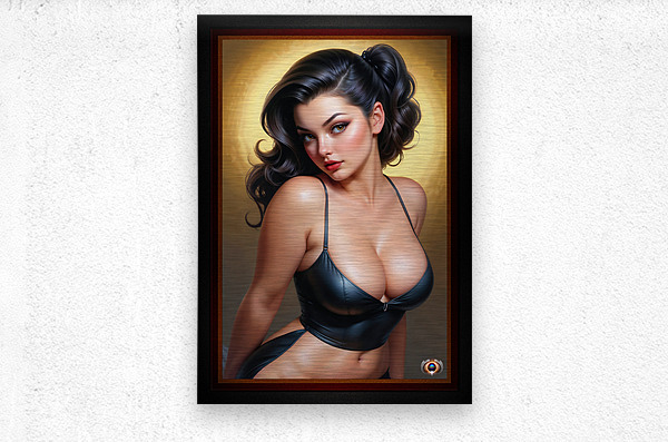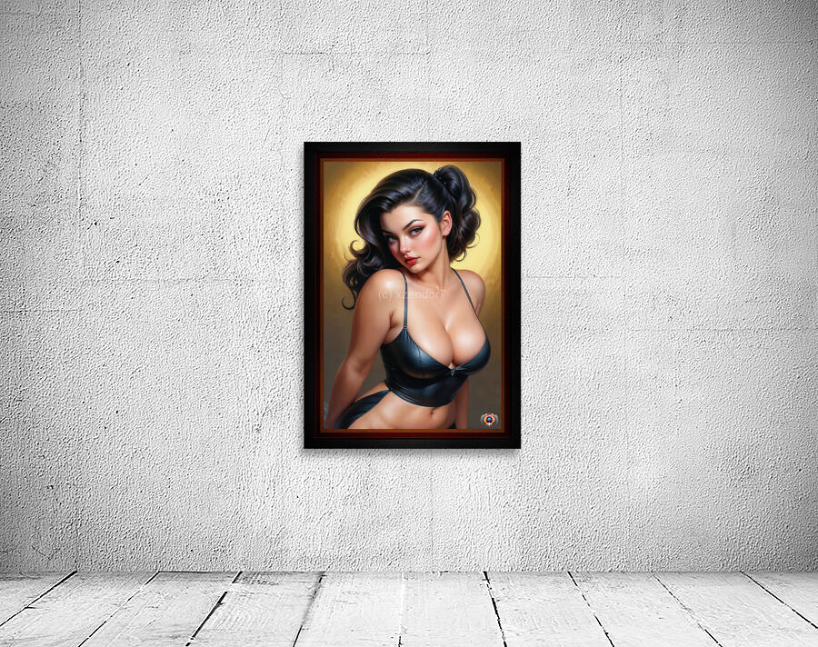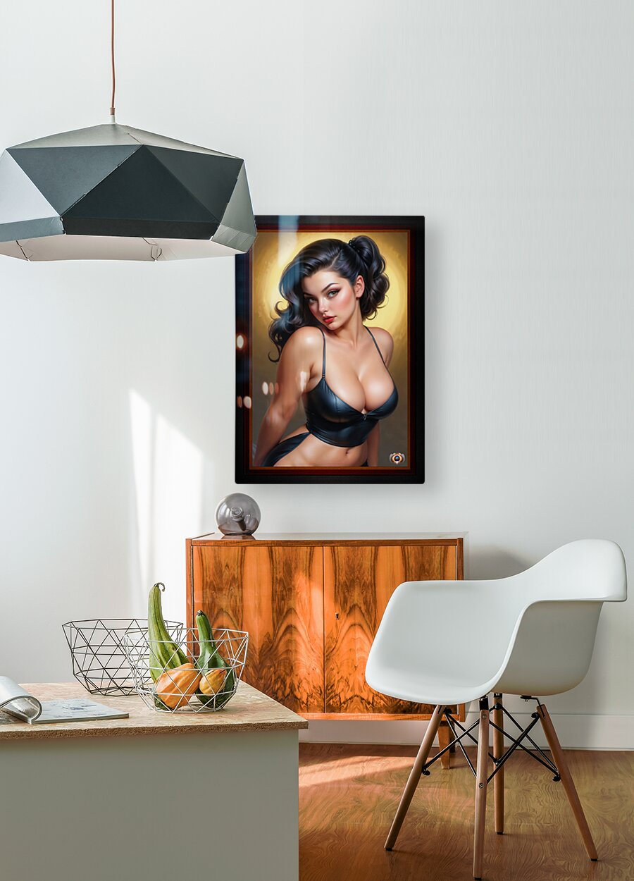 Get this artwork "An Exquisite Raven Hair Pinup Girl Temptress Gorgeous AI Concept Art by Xzendor7" in a framed print.