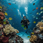 The mural is a high-quality depiction of an underwater scene featuring a male diver exploring the depths of the ocean. He is surrounded by a vibrant marine ecosystem, with various species of fish swimming gracefully around his . The mural captures the intricate details of the underwater flora, showcasing a variety of aquatic plants that sway gently with the currents. The clarity of the image allows for a close-up view, highlighting the textures and colors of the coral reefs, the scales on the fish, and the divers' gear. The overall scene is a mesmerizing blend of natural beauty and human adventure, inviting viewers to immerse themselves in the wonders of the ocean's depths.