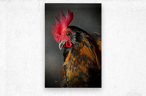 The artwork is a stunningly detailed and vividly expressive depiction of a rooster. The vibrant colors of the rooster's feathers—a blend of rich oranges, browns, and specks of darker hues—exude vitality and command attention. The intricate texture and detailed rendering of the feathers highlight the artist's keen attention to detail and an impressive mastery of technique. The intense red of the rooster’s comb and wattle contrasts sharply with the more muted background, thus drawing the viewer’s eye immediately to the subject. There is a palpable sense of depth and dimension; the rooster almost seems ready to emerge from the canvas, adding an element of realism that is truly commendable. There is a powerful sense of presence in the roosters eye, which is sharp and exudes a mix of curiosity and confidence. The artist has captured the glint perfectly using it as an emotional focal point that adds depth and personality to the rooster. The underlying narrative in this artwork speaks to the natural beauty and elegance of a rooster, a creature often overlooked in the pantheon of animal representations.