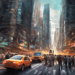 Vibrant and bustling city street with busy traffic, bright lights, and towering skyscrapers, chaotic, fast-paced, cityscape, high detail