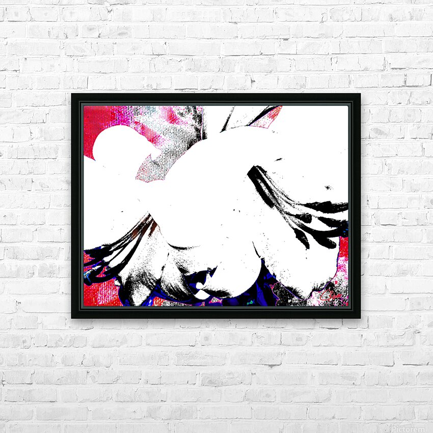 Once a close up photo of Lily flowers and a hand painted acrylic, laterally combined and digitally manipulated into a high-contrast design. A dynamic abstract representation of a Lily Flowers dominates the frame, with a stylized rendering that emphasizes the petals and stamens of the flowers. Bold pink and black colors create a stark background, contrasting with the white silhouette of the Lily petals to accentuate their shape and movement.