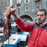 Piscaria the street daily market in Catania Sicily Italy. Fresh fish meat vegetables