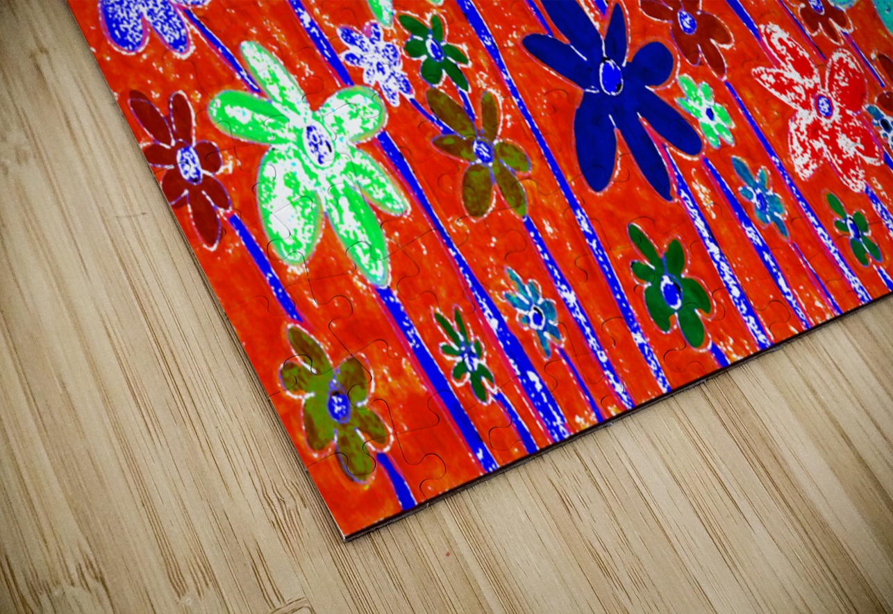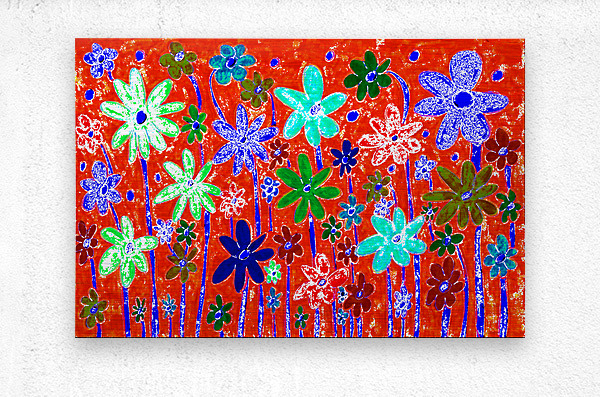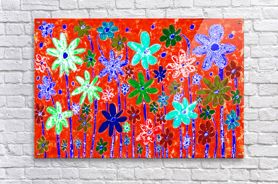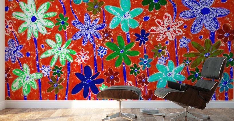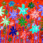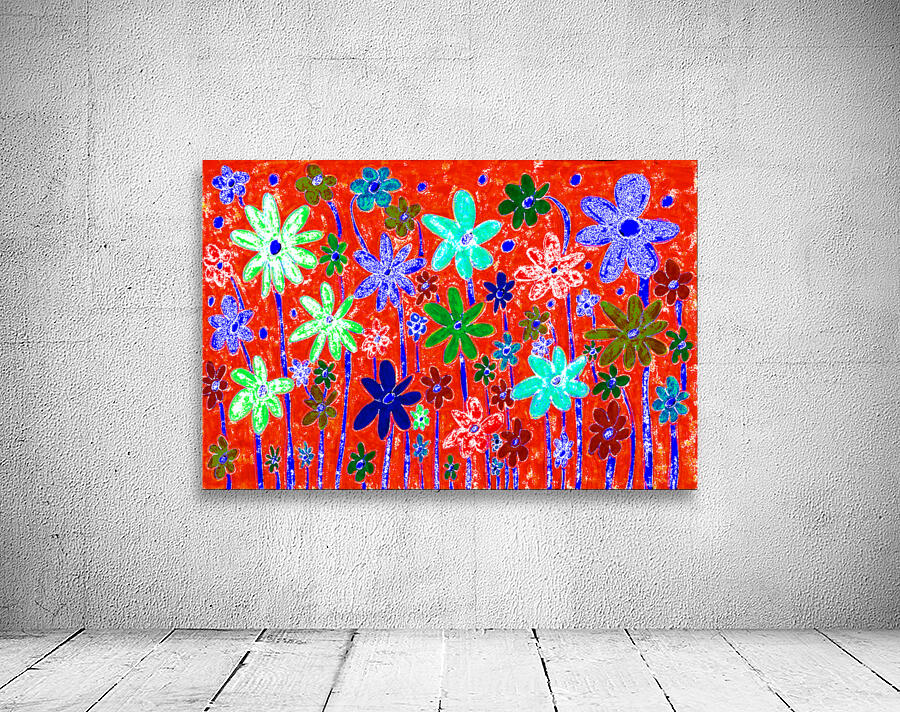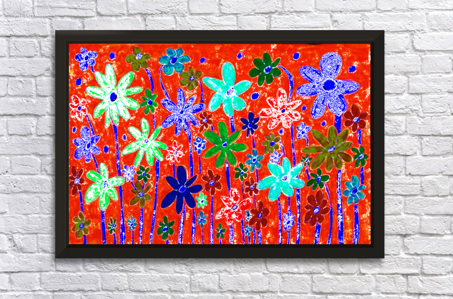 Originally a hand drawn nature inspired design created using coloured ink pens and paper. Laterally digitally manipulated into vivid colours which bring to life a collection of whimsical flowers standing tall against a textured colourful background. The simple playful nature of this work is showcased by the variety of flower shapes and the use of contrasting hues that pop out visually.