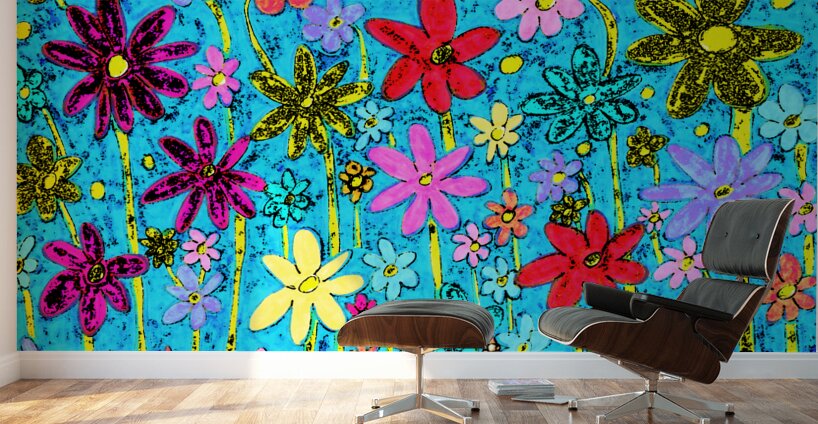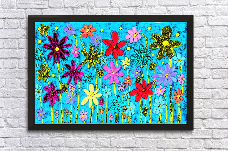 Once a hand drawn nature inspired design created using coloured ink pens and paper. Laterally digitally manipulated into a vibrant collection of stylized flowers which dominates the frame with a variety of colours against a textured blue background. Each flower has a unique shape, colour, and pattern, creating a cheerful and eclectic display.